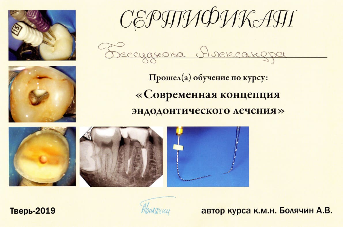 - 2019 — «Современная концепция эндодонтического лечения» курсы по эндодонтии от к.м.т. Болячина А. В. (Тверь)