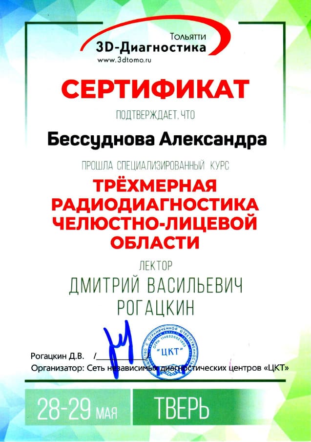 - 2022 — Специализированный курс «Трехмерная радиодиагностика челюстно-лицевой области». Лектор Дмитрий Васильевич Рогацкин