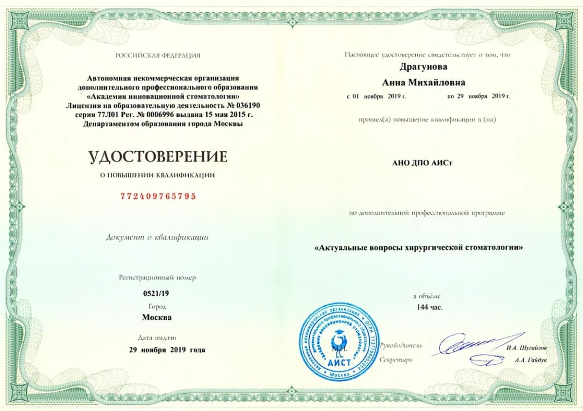 Я очень доволен работой стоматолога Драгуновой Анны Михайловны, она настоящий профессионал своего дела! Мне удалось успешно пройти процедуру удаления части зуба, которая была проведена грамотно и безболезненно, а главное, врач сумела сохранить мой зуб. За это я ей очень благодарен!