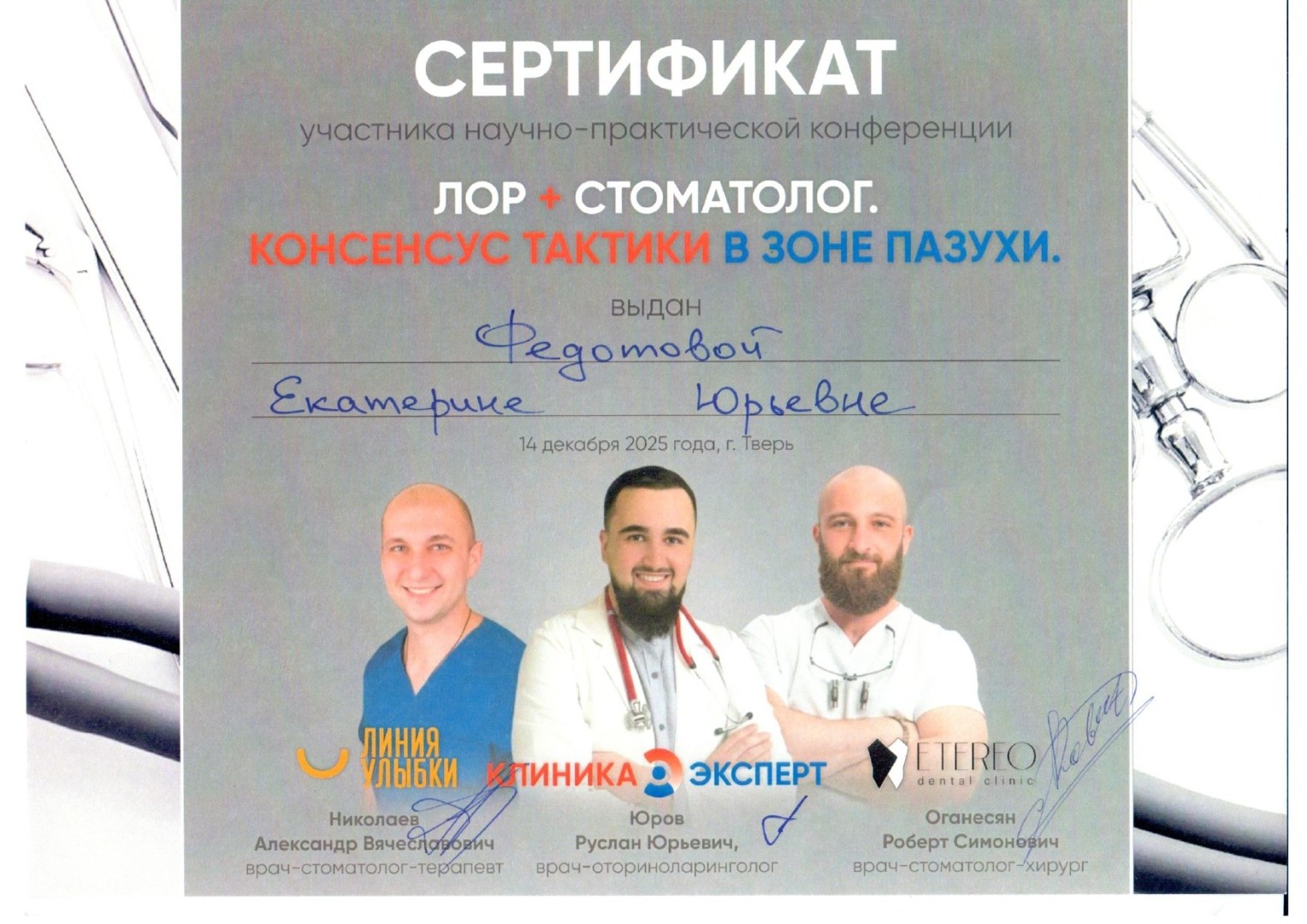 - 2025 — Сертификат участника научно-практической конференции «Лор + стоматолог. Консенсус тактики в зоне пазухи»