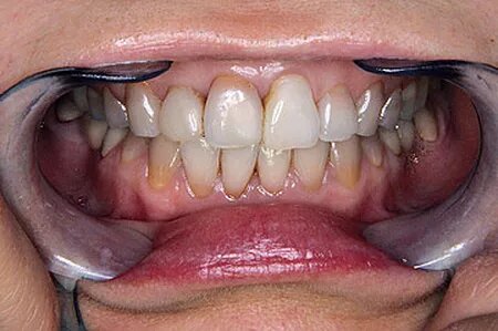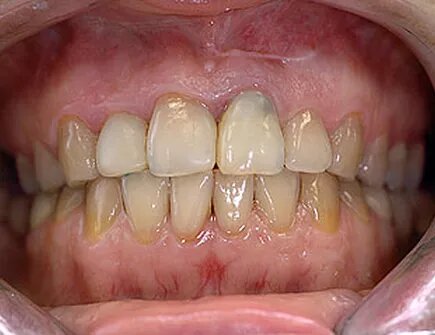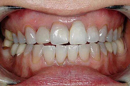 Молодая привлекательная женщина обратилась в клинику «Дента-Люкс» с многочисленными жалобами. Она была неудовлетворена предыдущим лечением. Её не устраивали ортопедические конструкции. Она просила улучшить цвет зубов и избавить её от тёмного пятна на левом верхнем центральном резце. Для того, чтобы скрыть дефекты цвета проблемного зуба, его предлагалось обточить (препарировать), а затем восстановить искусственной коронкой. От такого варианта пациентка отказалась.
