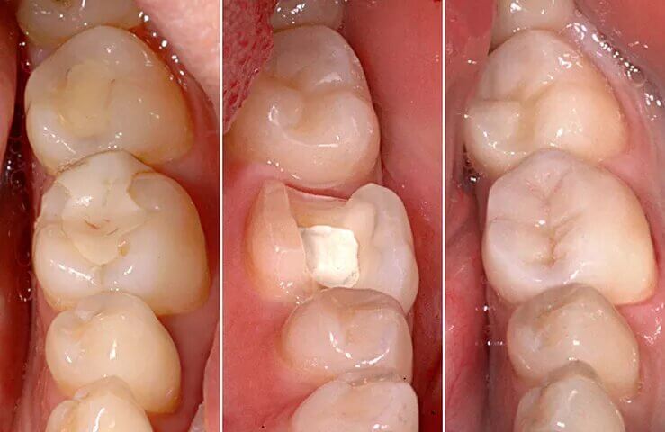 Справа - результат протезирования вкладкой из спечёной керамики.